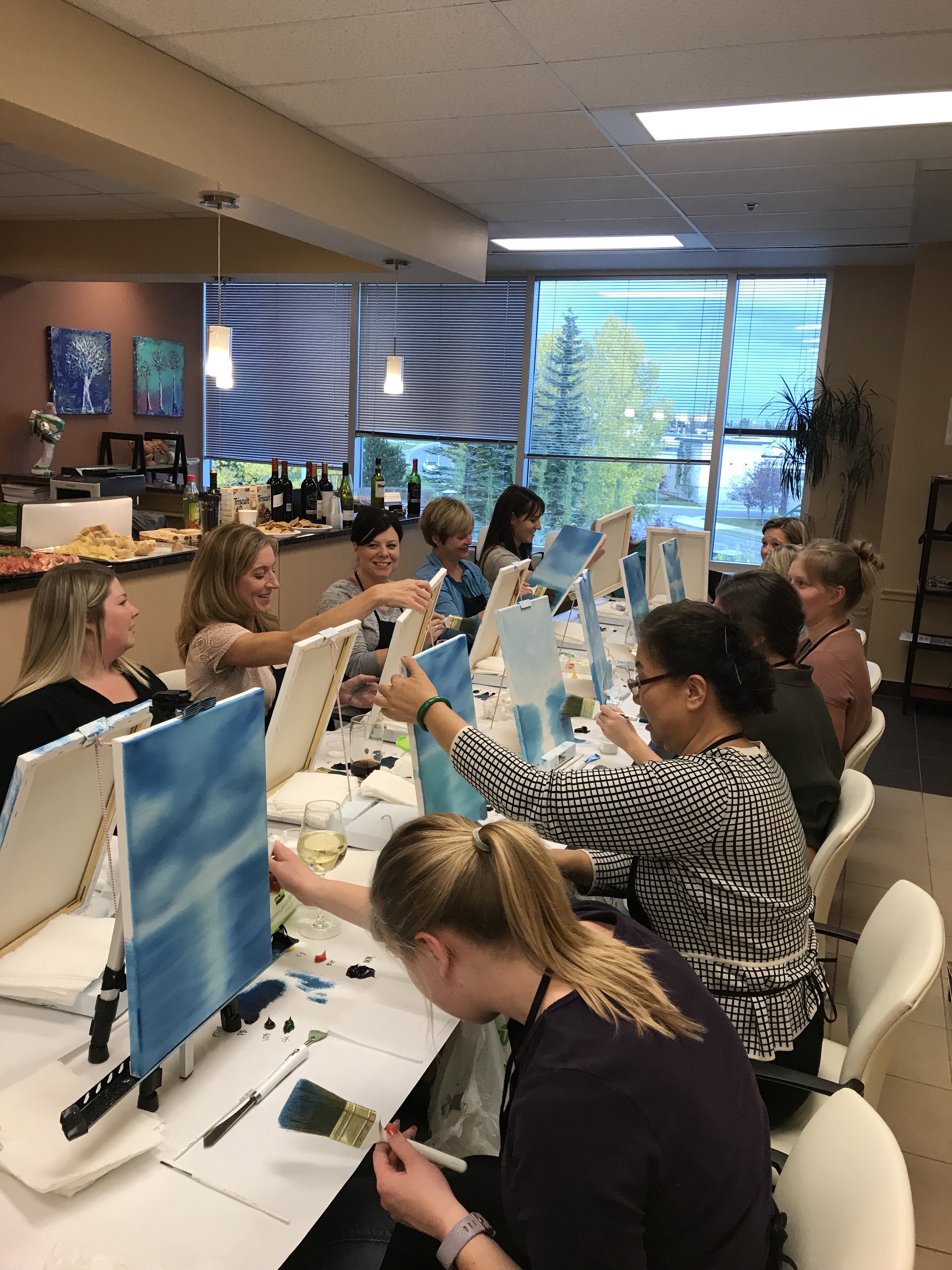 I shared a fun Bob Ross Style®️ oil painting class with an awesome team at Pureform Radiology – Crowfoot Clinic. It was a first time experience painting with oils for most and they did a great job! I took great pleasure in painting with this talented and fun group of individuals in such a great clinic! Many thanks to the Pureform Radiology Crowfoot Clinic for choosing my Bob Ross Style®️ Oil Painting Class for a team building activity! 😀🌈🎨