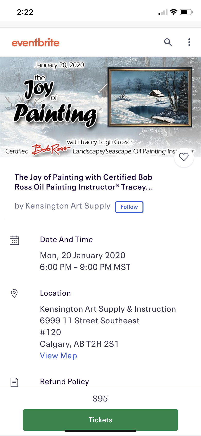 Let’s have fun creating a Bob Ross Style wet on wet oil painting while social distancing in a fun positive space at Kensington Art Supply, Nov 18th, 6-9 pm! Due to COVID 19 guidelines there is a limit of 7 painters per class and masks are required. The use of all supplies are included to create your masterpiece which is yours to keep or gift to someone special. Let’s embrace our snowy winter landscape with a warm splash of color!