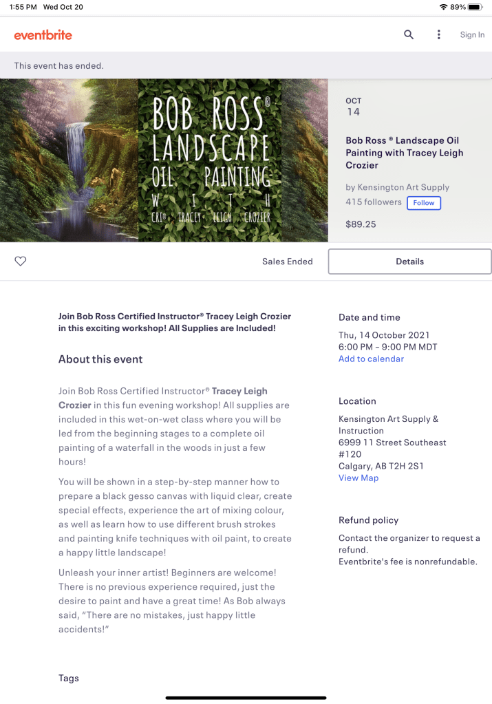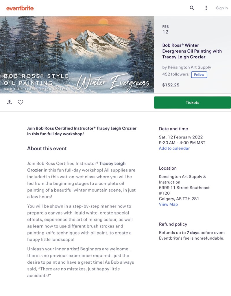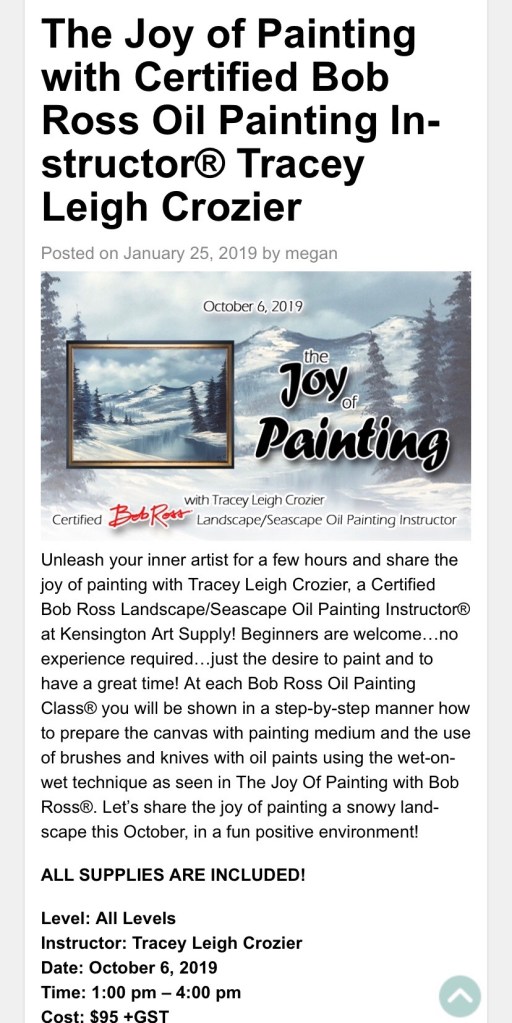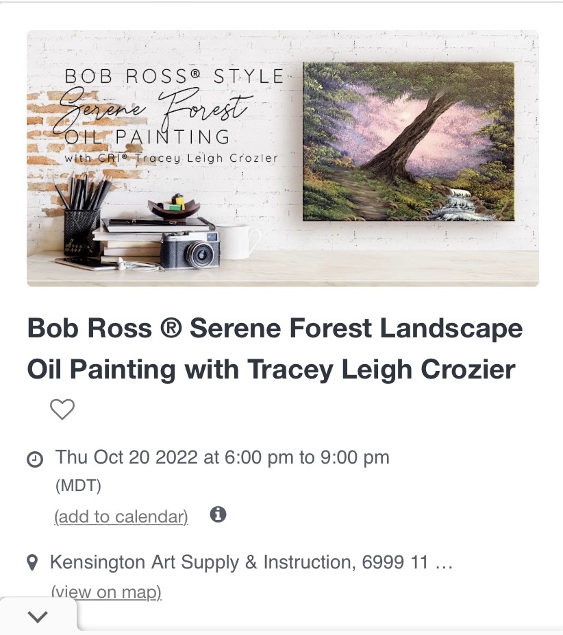 September 25, 2025 6-9 pm at Kensington Art Supplyhttps://www.eventbrite.ca/e/bob-ross-nature-scene-oil-painting-with-cri-tracey-leigh-crozier-tickets-1487284691549