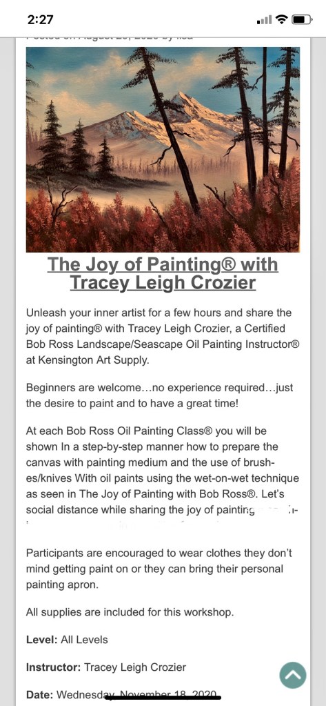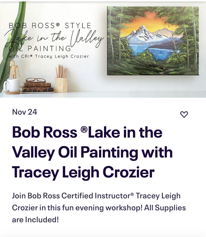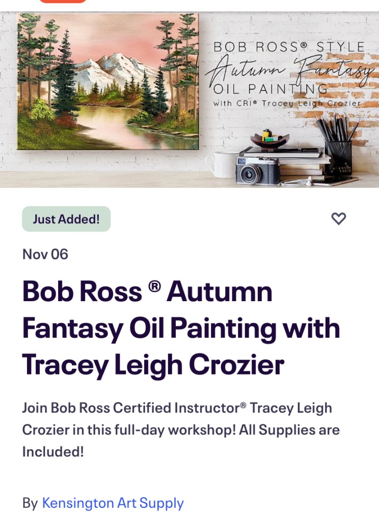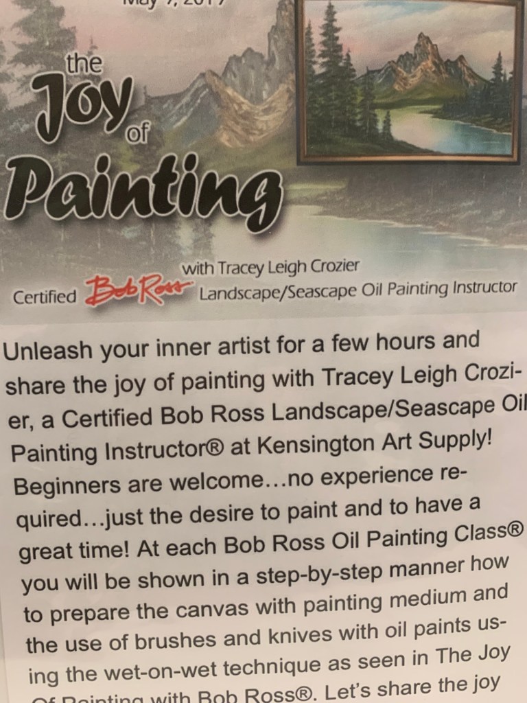 May 1, 2025 6-9 pm at Kensington Art Supply. https://kensingtonartsupply.com/workshop/bob-ross-mountain-lake-oil-painting-with-tracey-leigh-crozier-may-1-2025/