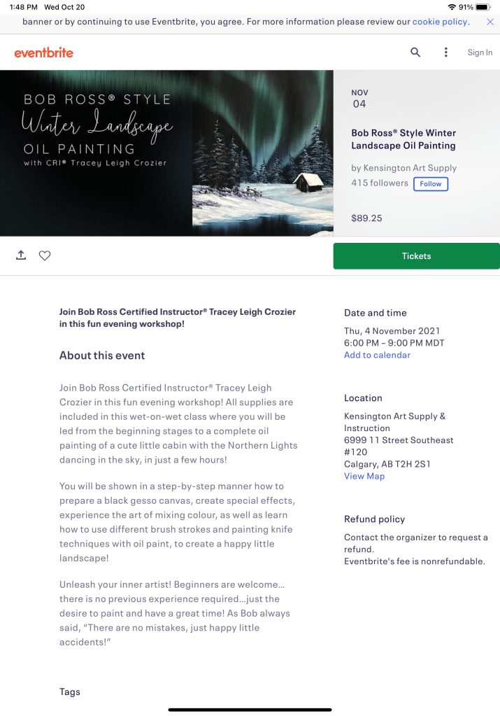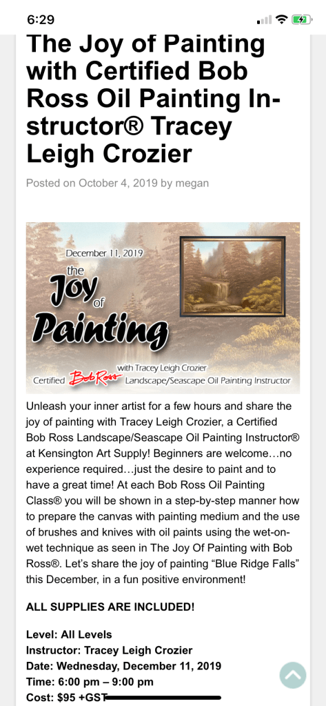 December 11, 2025 6-9 pm at Kensington Art supply.https://www.eventbrite.ca/e/bob-ross-aurora-waterfall-oil-painting-with-cri-tracey-leigh-crozier-tickets-1583822418489